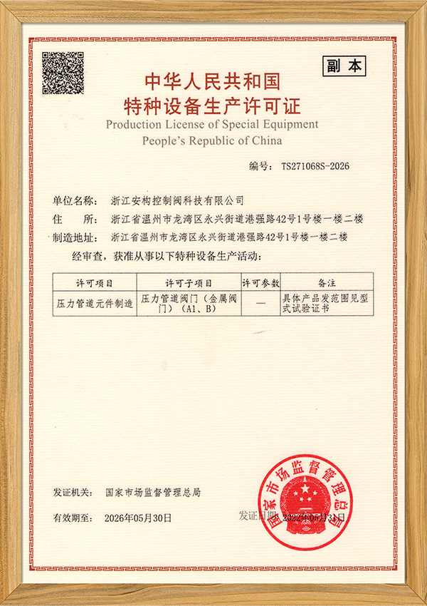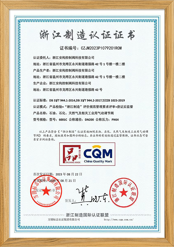 浙江安構控制閥科技有限公司生產的6001C系列產品:石油、石化、天然氣及相關工業用氣動調節閥順利通過浙江制造認證。 浙...