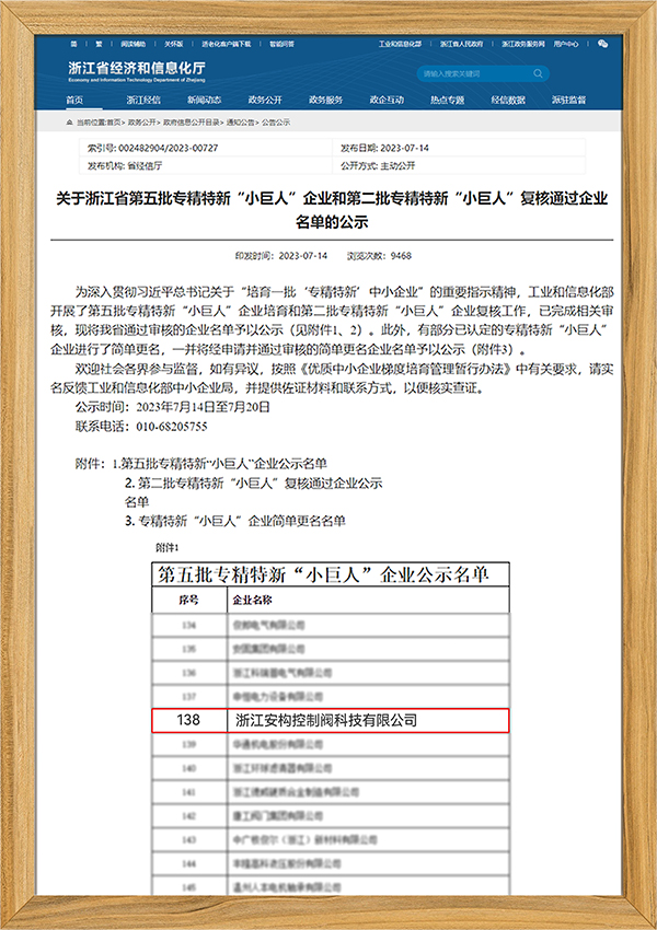 近日,經國家工業和信息化部認定的《第五批專精特新小巨人企業》培育名單中,浙江安構控制閥科技有限公司榮譽在列!! ...